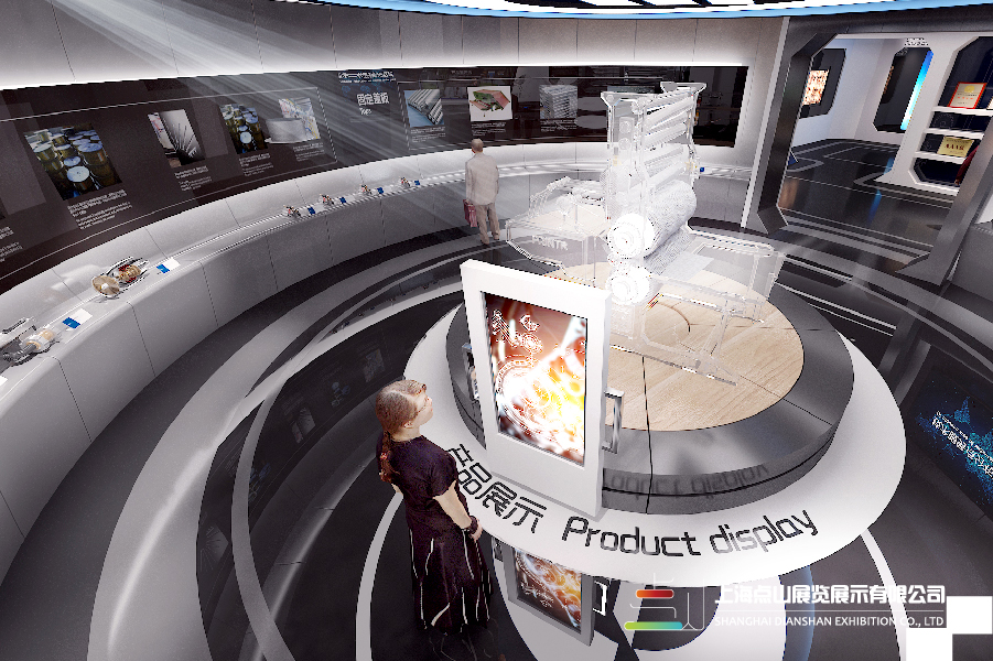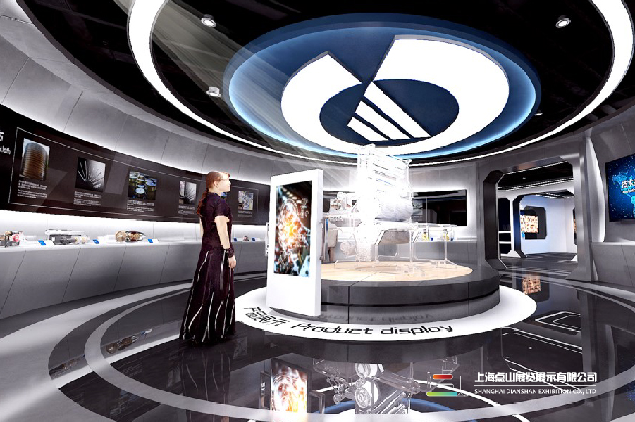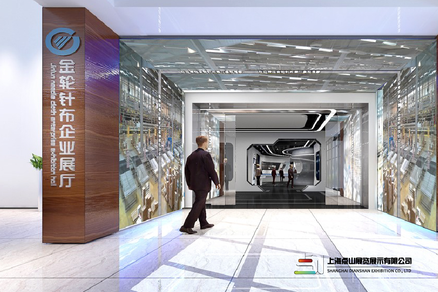展廳包含金輪企業(yè)文化篇、發(fā)展篇、技術創(chuàng)新篇、服務篇、成果篇和未來篇共6個篇章。設計師汲取企業(yè)logo、企業(yè)產品以及跟產品相關的織線為主要元素,是整體的空間更加豐滿生動。其中服務篇是整個展示空間中的重中之重,我們在整體造型上結合企業(yè)產品的特性及造型,將其打造成相對圍合的獨立空間,凸顯企業(yè)核心的地位,呈現(xiàn)科技力量凝聚一體的強大氣場?,F(xiàn)場采用針布機實物和多媒體結合展示,可以讓參觀者直觀感受梳理器材發(fā)揮的核心作用。